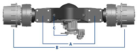A) Axle Mounting Centers B) Track C) Carrier Standout with 72N Input Yoke 14.56" (369.8 mm)